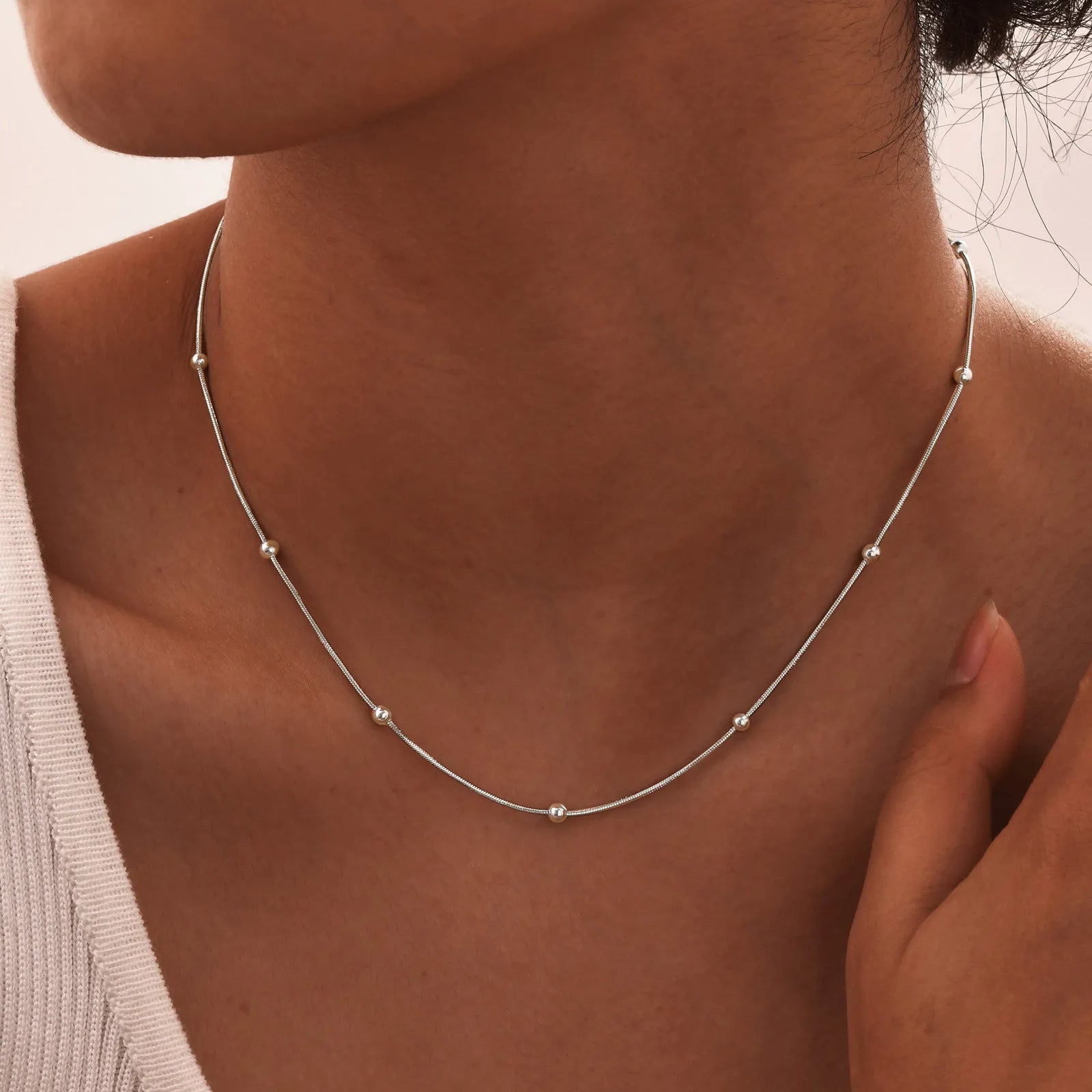 Elevate your style with this minimalist necklace featuring a sleek chain accented by delicate silver beads. Crafted from sterling silver, this lightweight and versatile design is perfect for daily wear or layering with other jewelry. Its clean and modern aesthetic makes it an effortless addition to any outfit, whether casual or formal.